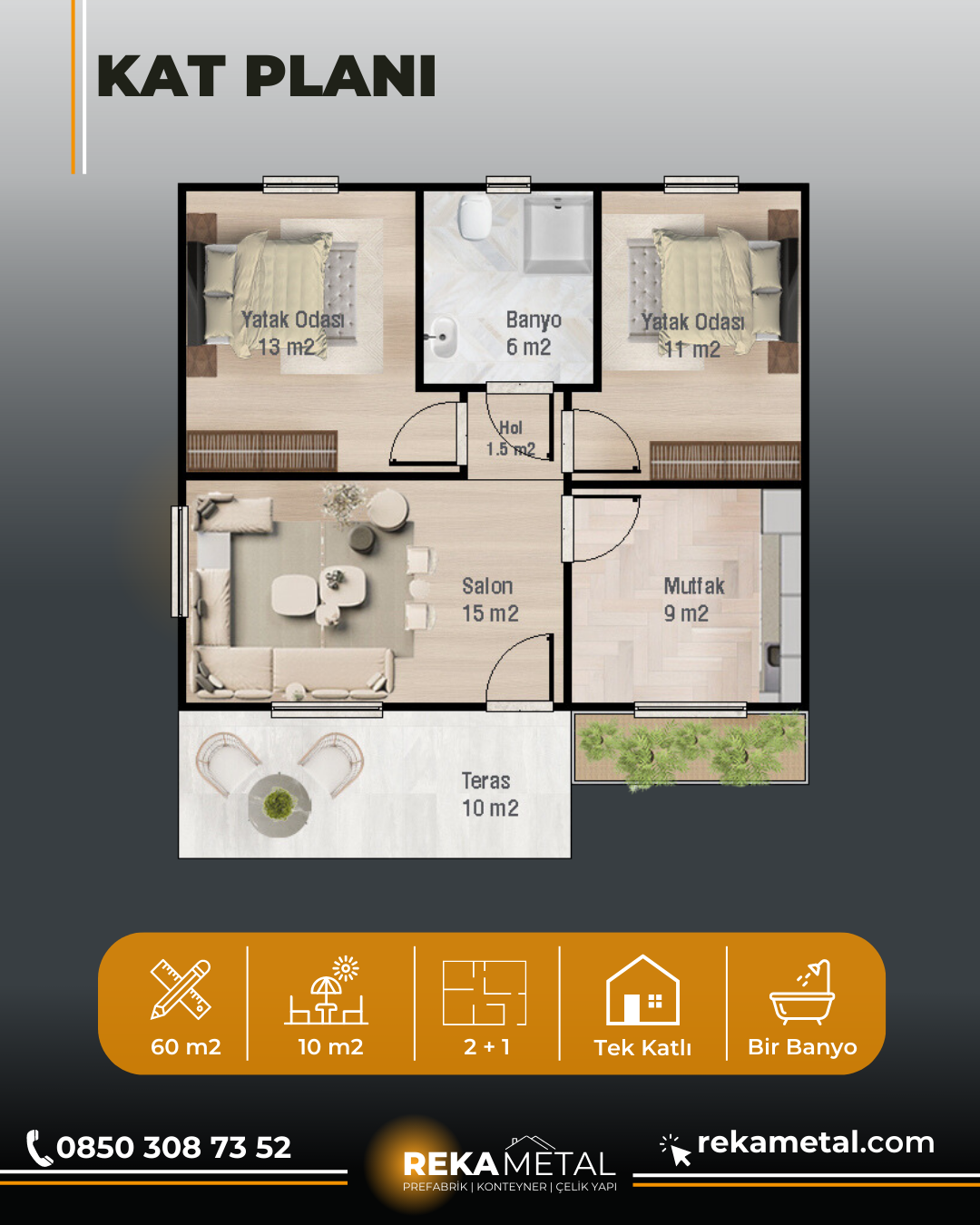 RekaPan – Engelsiz 60 m2, 2+1 Tek katlı modelimiz, mutluluğa giden yolda engellerin olmayacağını bilenler için tasarlandı.