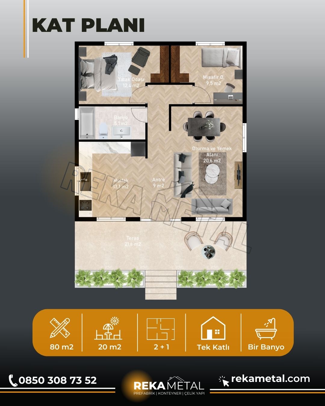 RekaPan – Huzur 80 m2, 2 + 1 Tek katlı modelimiz, geniş verandası ile gününü açık alanda geçirmek isteyenler için tasarlandı.